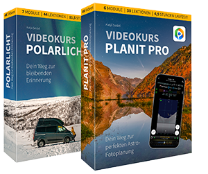 Ergänzend zu meinem Buch habe ich zwei ausführliche Videokurse zu konkreten Themen daraus erstellt. Darin ist nicht nur viel Herzblut, sondern auch mein praktisches Wissen aus den letzten 10 Jahren geflossen. Schau gern mal rein, wenn du mehr über die Themen Astrofotoplanung mit der App Planit Pro oder die Polarlichtjagd wissen möchtest.