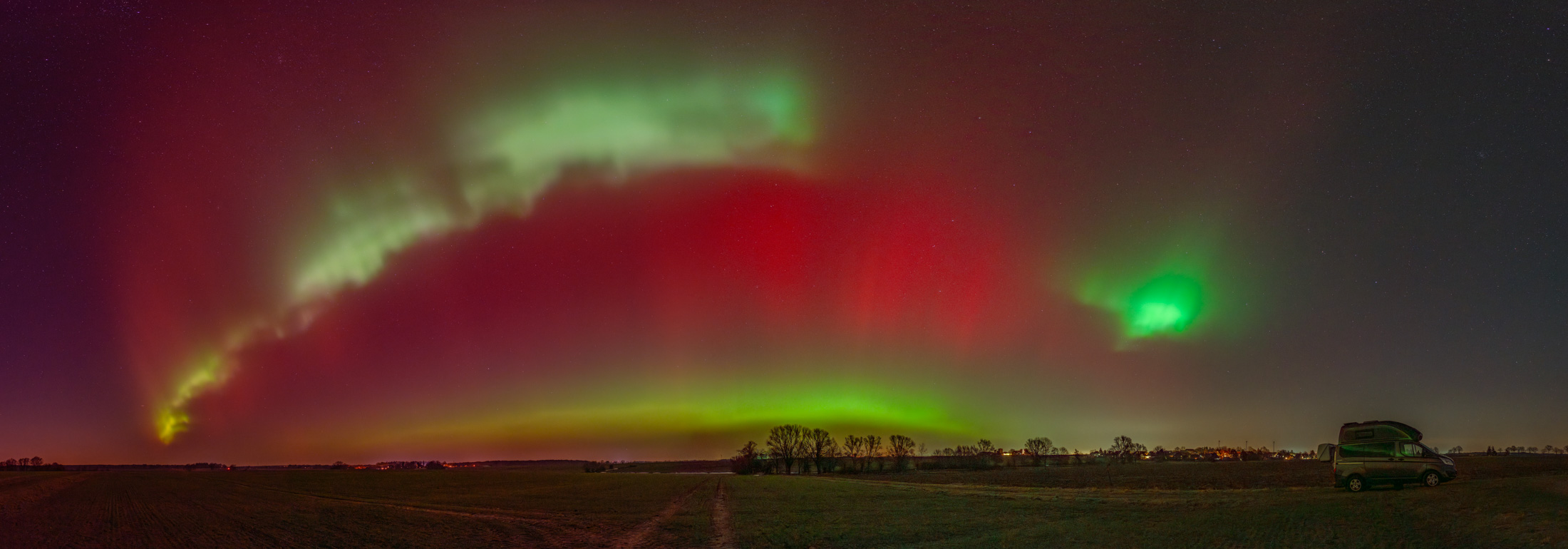 22:13 Uhr war sowohl das rote als auch das grüne Polarlicht in Richtung Norden deutlich mit dem bloßen Auge zu sehen und bereits sehr weit ausgedehnt. Hier musste schon ein zweizeiliges Panorma her.